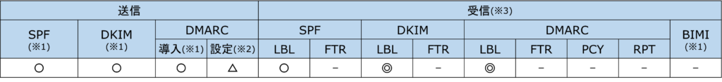 ・LBL:ラベリング。Authentication-Resultsヘッダにしている場合には「◎」、Received-SPFヘッダにしている場合には「○」、導入していない場合には「-」と表示しています。